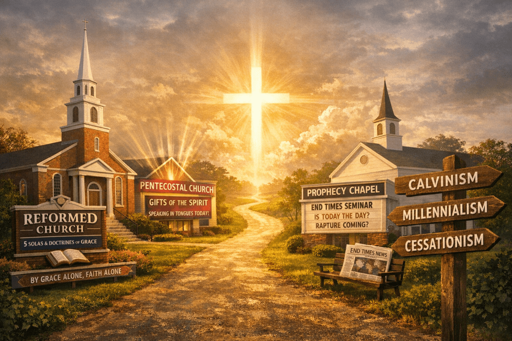 Walk down the main street of almost any town, and you’ll see it: a row of churches, each claiming to follow Christ—but each telling a very different story about what that means. One proudly declares itself Reformed, emphasizing the Five Solas and doctrines of grace, preaching a careful, methodical theology of God’s sovereignty. Next door, another brims with energy, speaking in tongues, emphasizing the gifts of the Spirit, and calling the congregation to expect miracles and prophecy in every service. A few blocks away, yet another church is consumed with the end times, pouring over dates, headlines, and signs in the sky, warning believers to be prepared for the coming tribulation.